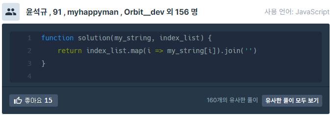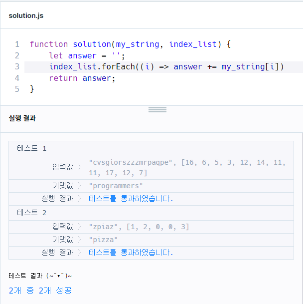 index_list 를 map 으로 요소 하나하나의 값 = i 번째 글자를 my_string 에서 빼온 뒤, 그 글자들을 join 메서드를 사용해 합쳐서 반환해주었다.