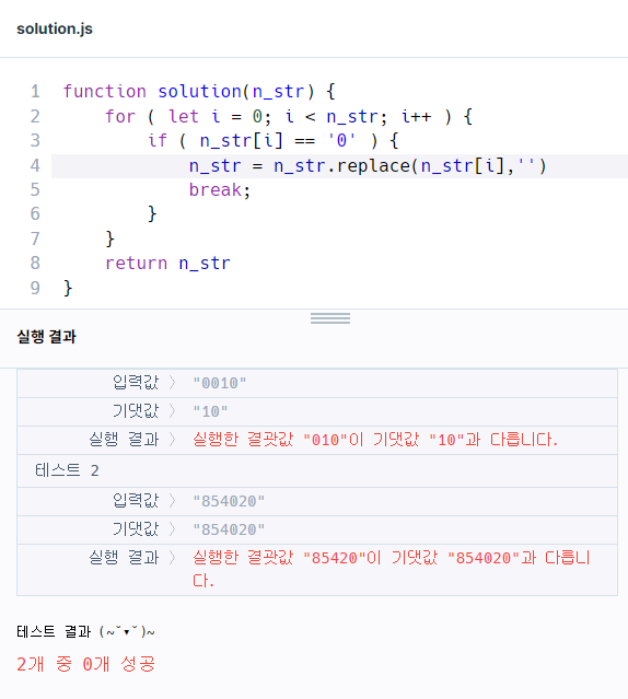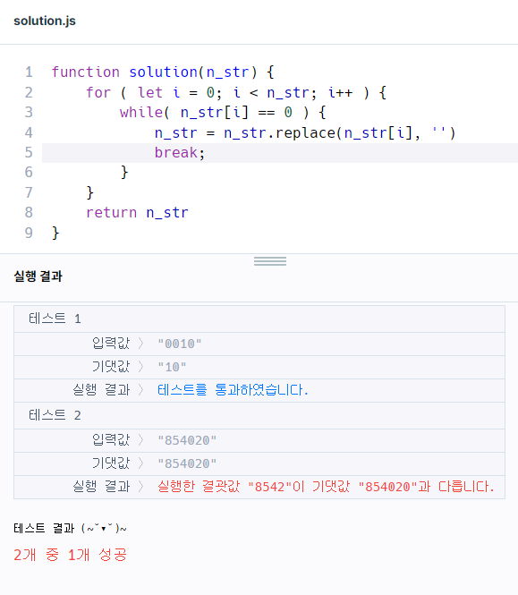 그리고 어쨌든 0을 찾아야 break 가 되어서 맨 앞이 아닌 곳에 있는 0까지 지워버렸다.