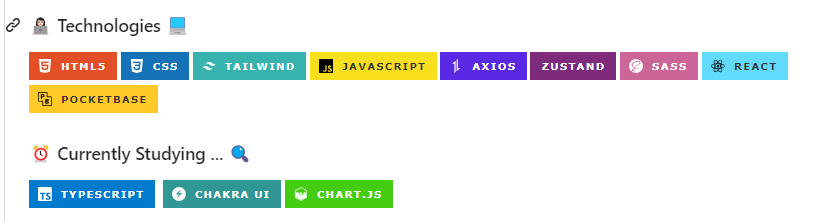 그리고 라이브러리, 언어 등등을 구분해서 넣으시는 분들도 많던데 그렇게 하려니 너무 머리가 아프고 node.js , pnpm , eslint 나 prettier 같이 자잘한..? 것들까지 쓰면 한 번 써본 것도 다 넣어야하는지도 애매하고 해가지고 그냥 간단하게만 .. 작성했는데 핵심적인? 더 적을거리가 있다면 공유해주세요!!! :)